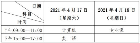 (四)考试时间。全省统一考试时间为2021年4月17日至18日。具体考试时间与考试科目安排如下(北京时间):