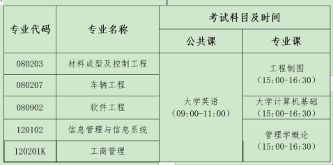 注:①专升本考试科目分公共课和专业课,公共课总分100分,专业课总分200分;②参加《工程制图》课程考试的学生请自带画图工具;③各科目考试大纲、参考教材请见附件2。