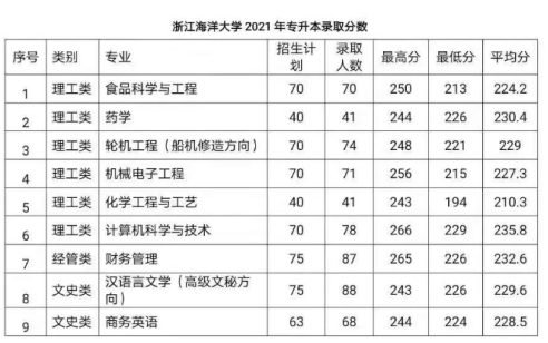 5月18日,浙江海洋大学2021年“专升本”招生录取顺利进行,一次性完成全部招生计划。招生计划数573人,录取618人,同分多录取45人,分专业录取分数线见下表: