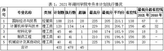 湖州学院2021年专升本共5个专业(国际经济与贸易、计算机科学与技术、材料化学、制药工程、机械设计制造及其自动化)招生计划共计433人,全部专业均在首轮一次性完成录取,各专业最低分超省控线均超过去年。共执行计划数478人,超过计划数45人。具体计划执行情况详见表1:
