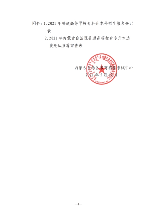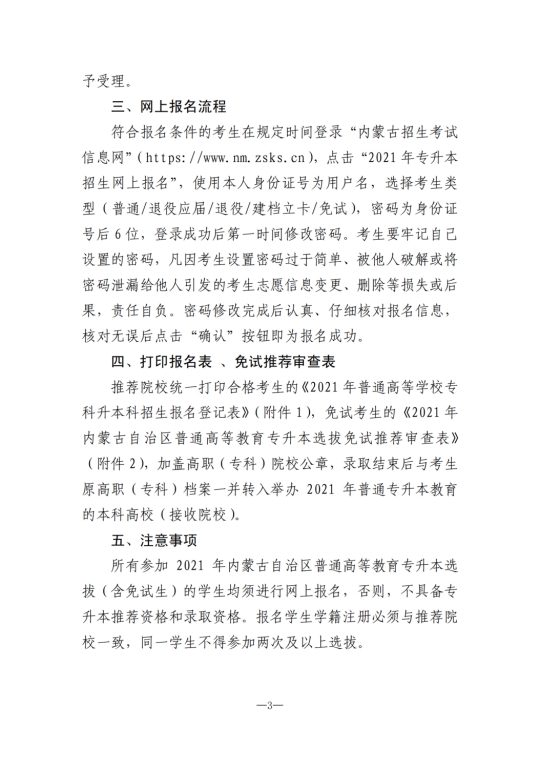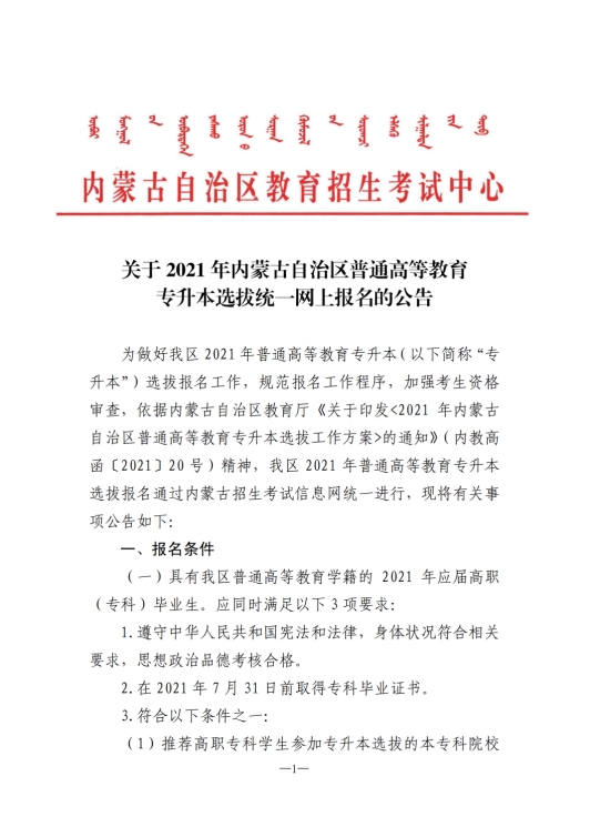 关于2021年内蒙古自治区普通高等教育专升本选拔统一网上报名的公告