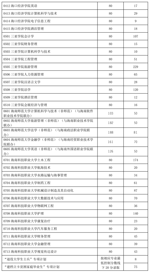我省高职(专科)升本科招生录取分数线在考生成绩不低于80分的基础上,按照招生学校各专业计划数1:1比例从高分到低分划定。其中“退役大学生士兵”和“建档立卡贫困家庭毕业生”两个专项计划录取最低控制分数线为划定相应专业录取分数线下20分(详见附件1)。考生成绩不低于划定报考学校相应专业的最低录取控制分数线,则确认为所报考学校相应专业预录取的考生,考生也可向报考学校查询本人的预录取信息。