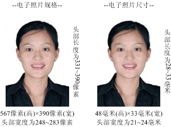 2.图像规格:567像素(高)× 390像素(宽),头部宽度为248~283像素,头部长度为331~390像素,分辨率300dpi,图像文件大小不超过5MB,JPG格式。图像尺寸为48毫米(高)× 33毫米(宽),头部长度为28~33毫米,头部宽度为21~24毫米。