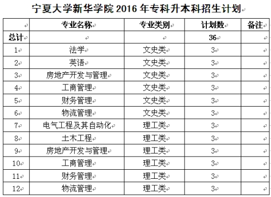 2017年宁夏专升本招生计划及专业基础课目录(参考)