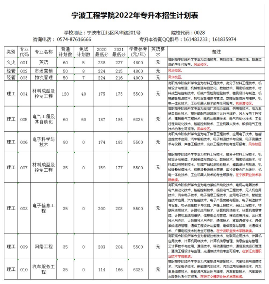 宁波工程学院2022年专升本招生计划表