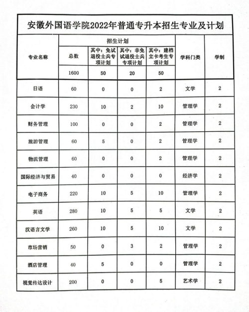 安徽外国语学院2022年普通高校专升本招生专业及计划