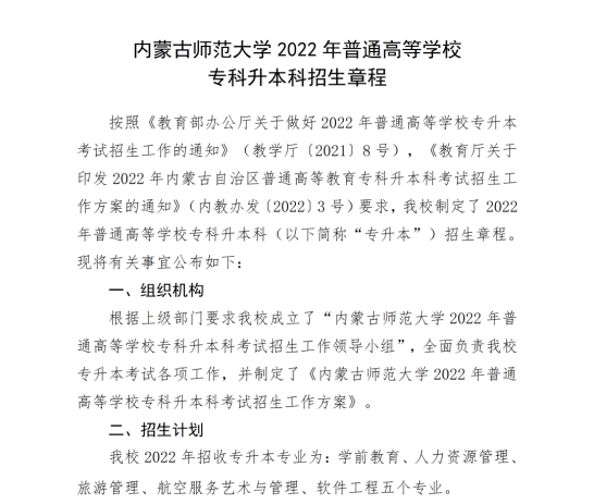2022年内蒙古自治区专升本统一考试招生工作实施方案