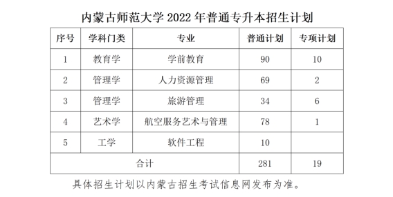 2022年内蒙古自治区专升本考试分校分专业招生计划