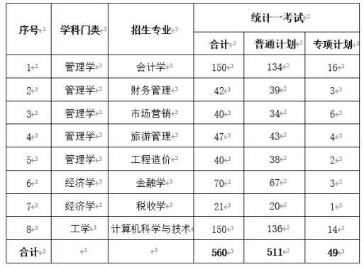 我校2022年拟招收计算机科学与技术、财务管理等八个专业,560人,如表1所示。