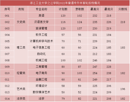 2022年 浙江工业大学之江学院专升本首轮投档分数线