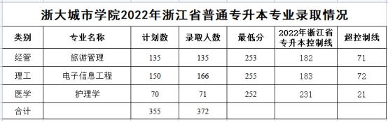 2022年浙大城市学院专升本专业录取分数线