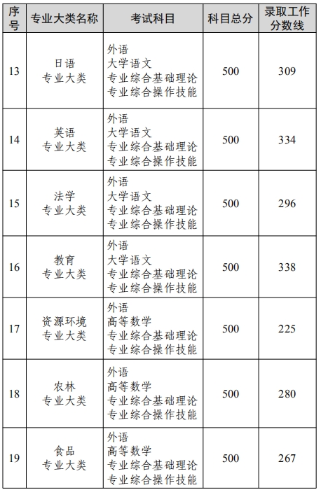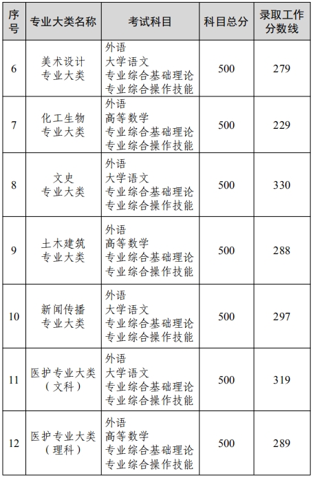 我省 2022 年普通高校“专转本”选拔考试各专业大类录取工作分数线已经省教育厅审定,现将各专业大类录取工作分数线通报如下: