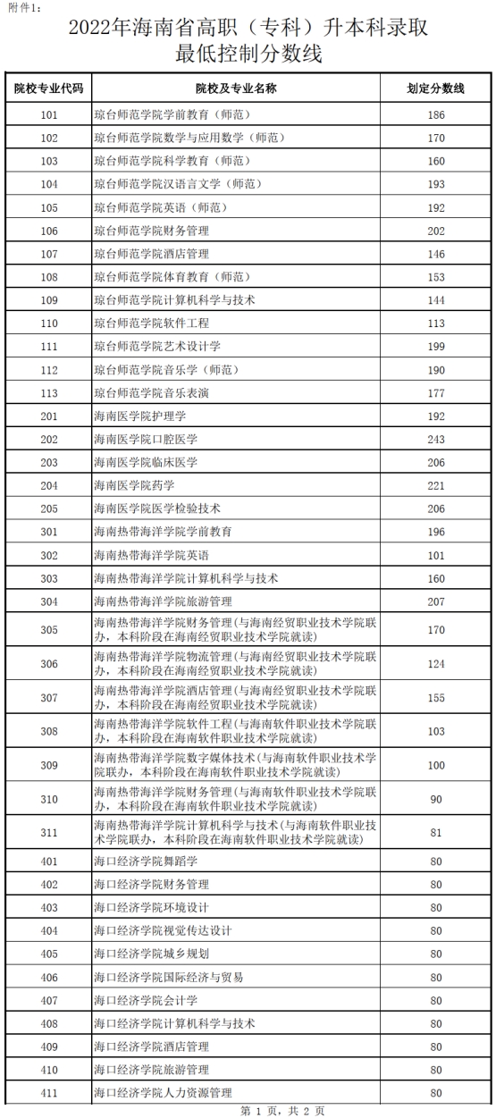 我省高职(专科)升本科招生录取分数线在考生成绩不低于80分的基础上,按照招生学校各专业计划数1:1比例从高分到低分划定。其中原“建档立卡贫困户家庭毕业生”专项计划录取最低控制分数线为划定相应专业录取分数线下20分(详见附件1),“退役大学生士兵”专项计划由学校根据职业适应性或职业技能综合考察结果,并结合考生在校期间成绩、服役期间表现等情况,综合评价,按照各专业招生计划数1:1的比例择优录取。考生成绩不低于划定报考学校相应专业的最低录取控制分数线,则确认为所报考学校相应专业预录取的考生,考生也可向报考学校查询本人的预录取信息。