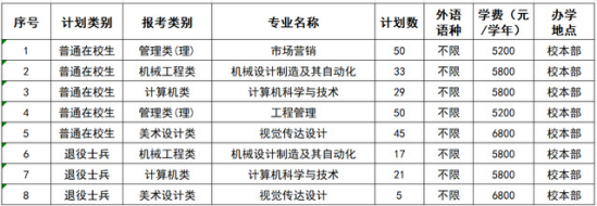 经省教育厅批准,2023年我校“专转本”招生计划250人,其中普通类招生计划207人,退役大学生士兵招生计划43人。具体招生计划如下:
