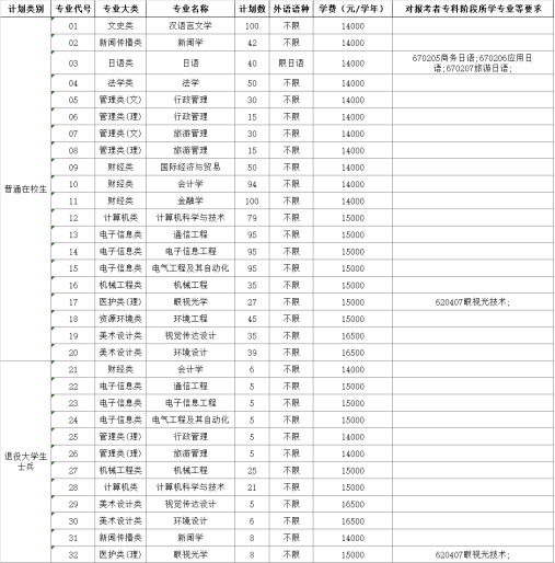 2023年我校普通高校“专转本”招生计划1215人,其中普通在校生计划数1111人,退役大学生士兵计划数104人。各专业招生计划及学费标准如下: