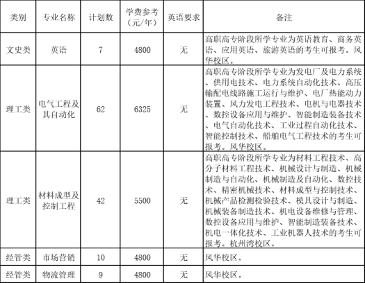 注:具体招生计划数及对应的招生专业范围以浙江省教育考试院公布为准;学费标准供参考,最终以物价部门批准公布为准;“备注”中注明条件的,符合条件的考生方可报考;没有备注说明的,表示没有特殊要求。
