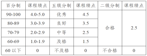 课程绩点与课程考核成绩的对应关系为: