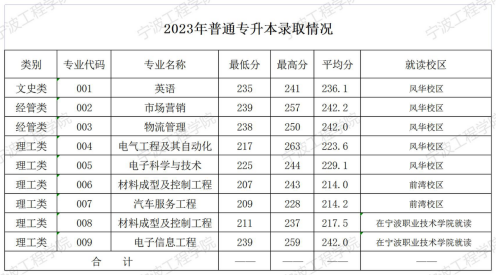宁波工程学院2023年普通专升本分专业录取投档线
