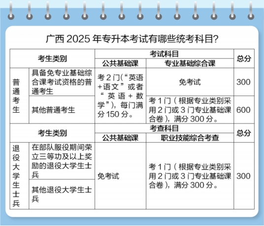 近日,自治区教育厅结合广西实际,发布了《广西普通高等教育专升本考试招生工作实施办法》。2025年起,广西统一实施广西普通高等教育专科层次起点升本科教育(以下简称专升本)考试招生,符合条件的普通考生及退役大学生士兵均可报考。关于该政策的具体实施办法,一起来看政策解读。