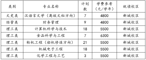 第十条 学校将招生专业分为文史、理工、经管三个招生类别,总计划83人,按专业对口原则实施招生。考生高职高专阶段所学专业须符合所报专业志愿的限报专业要求和体检要求,具体招生专业、计划如下表: