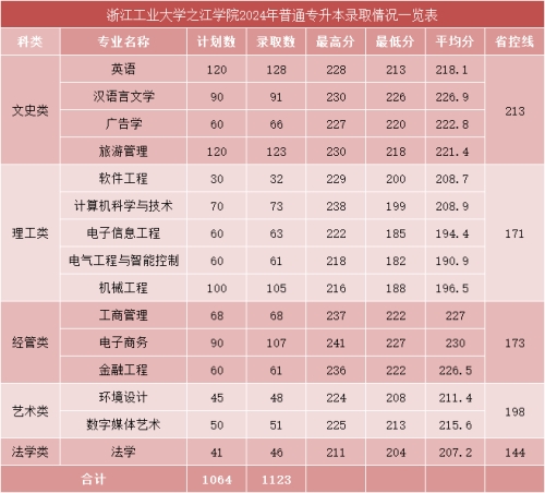 浙江工业大学之江学院2024年专升本录取分数线公告 我院2024年专升本计划招生1160个,实际录取1219个,我院专升本录取工作圆满结束。其中,免试专升本实际录取96个,普通专升本实际录取1123个(同分带入59个),各类别平均分超省控线较2023年均有提升。 普通专升本各专业投档情况如下: