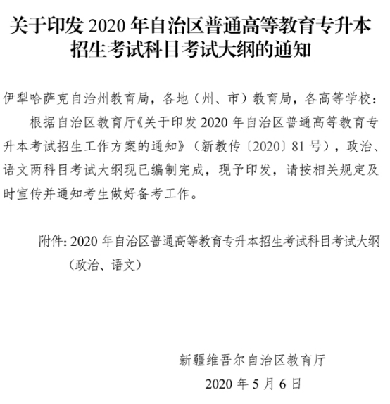 2020年新疆自治区普通高等教育专升本招生考试科目考试大纲的通知