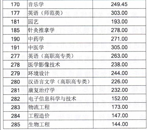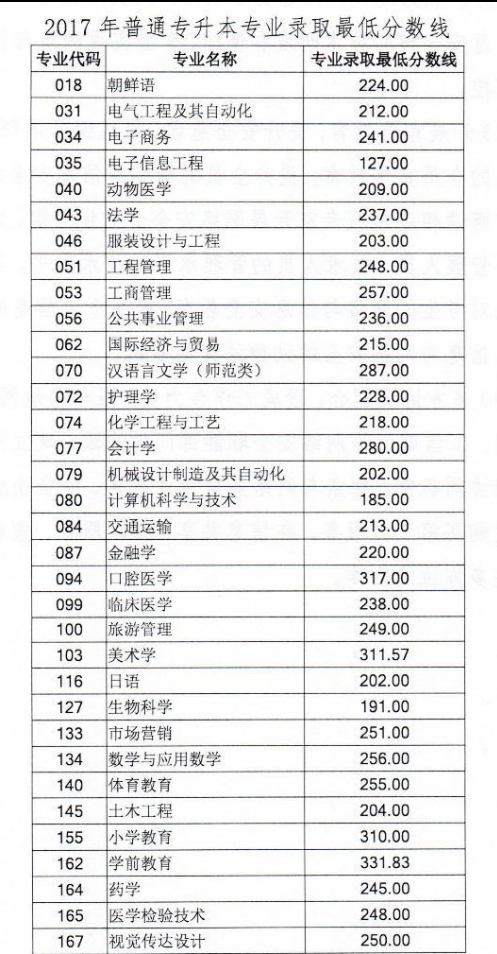 山东省2017年普通专升本专业录取最低分数线