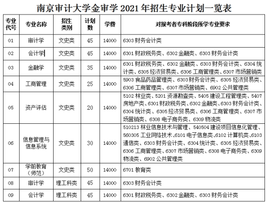 南京审计大学金审学院2021年面向全省招收审计学、会计学、金融学、工商管理、资产评估、信息管理与信息系统、学前教育(师范)、环境设计共8个专业。各专业计划及报考要求具体详见附表一。