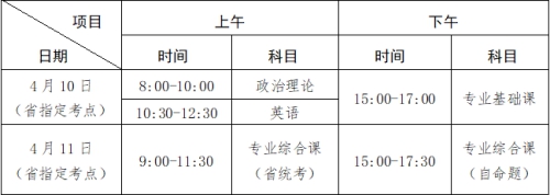 考试科目为四门,总分共500分。其中《政治理论》、《英语》和《专业基础课》满分各为100分,每科考试时间为120分钟;《专业综合课》满分为200分,考试时间为150分钟。