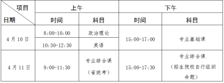 (四)普通专升本招生考试时间为2021年4月10日(星期六)至11日(星期日)两天,具体安排见下表: